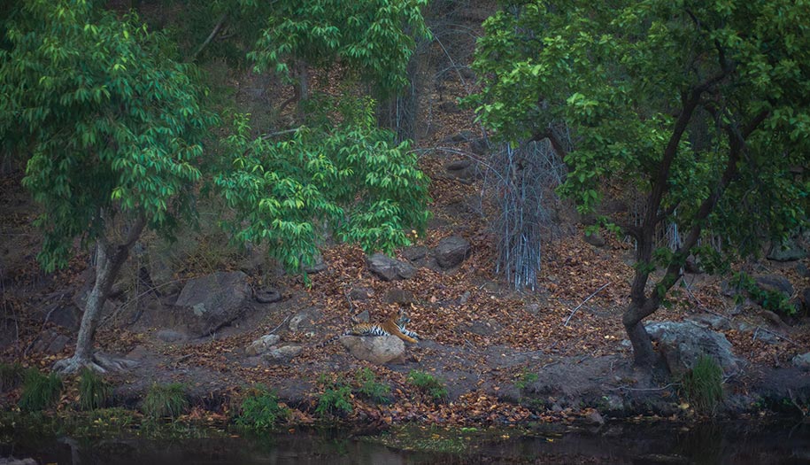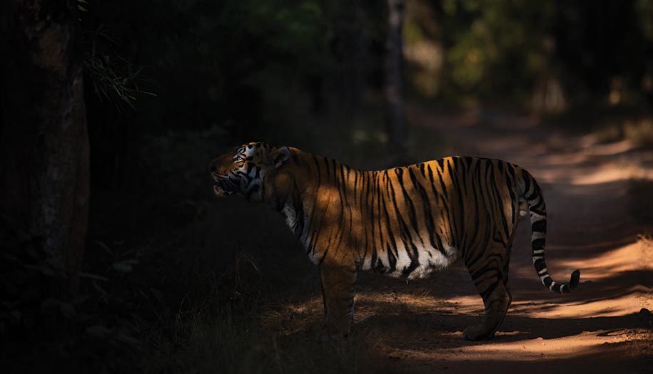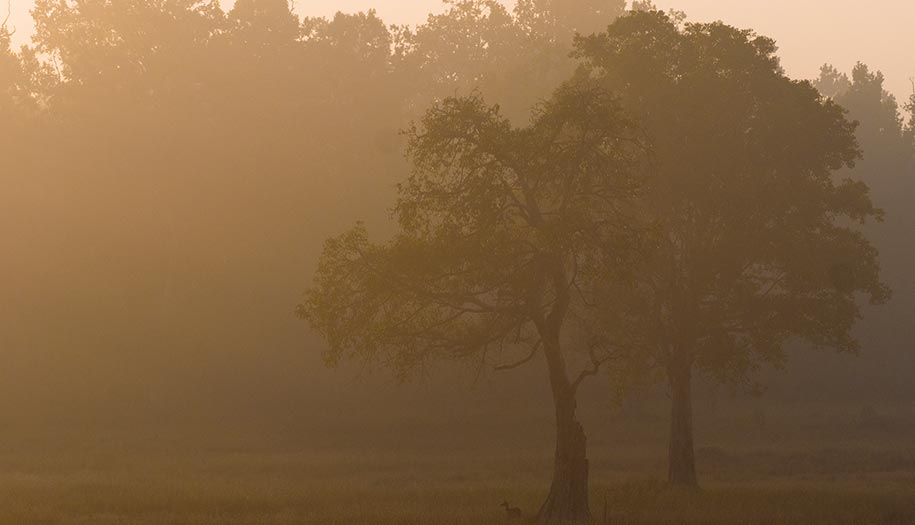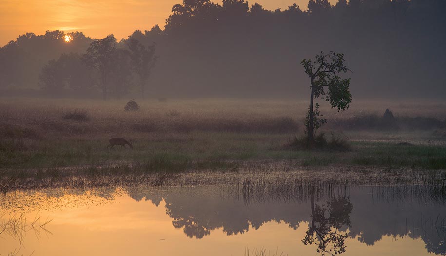 In Kanha, the forest feels alive with rhythm and color. Morning mist drapes the meadows as the first light dances across the sal trees. A peacock calls in the distance, deer lift their heads in alert, and the forest holds its breath—the tiger might be near. Safaris wind through sun-dappled clearings and quiet glades where barasingha stand poised in the shallow waters. The scent of wild grass and mahua blooms fills the air as the landscape shifts from dense forest to open plains. Every turn reveals a scene painted in gold and green—hornbills flitting overhead, gaur grazing silently, or a leopard melting into shadow. As evening falls, Kanha glows under a soft amber light, serene yet expectant. It is a place that awakens all the senses—a wild sanctuary where time slows, nature breathes deeply, and every heartbeat echoes through the jungle.