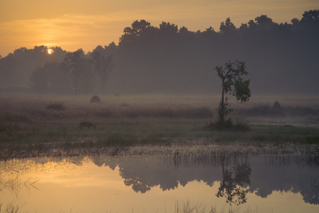 Fractured sunlight spills through mist-laced sal canopies as the vast meadows of Kanha National Park unfold like a living Eden. Among India’s most picturesque wildernesses, Kanha offers a breathtaking canvas of wildlife set against landscapes that feel almost ethereal. Dawn filters softly through towering trees as barasingha wade through glassy waterbodies their reflections rippling with light, while tigers move silently across golden grasslands. The park’s sweeping meadows, dense forests, and tranquil water bodies create exceptional visibility and depth for every safari. Each morning reveals a living masterpiece, wild yet serene, immersive yet timeless. Kanha retains a rare, abiding magic, where nature feels both pristine and profoundly alive.